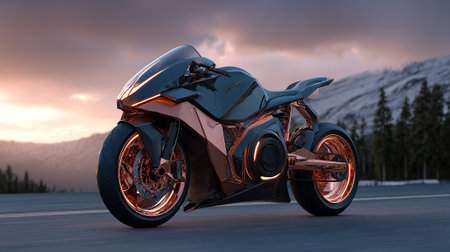 Futuristic Motorcycle Design Displayed at Sunset, a Sleek and Powerful Machine