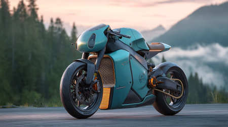 Sleek Modern Motorcycle Against Mountain Landscape Backdrop at Dusk