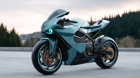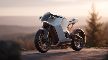 Sleek Futuristic Motorcycle Parked Against a Scenic Backdrop at Golden Hour