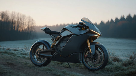 Sleek futuristic motorcycle parked on frosty ground amidst soft morning light