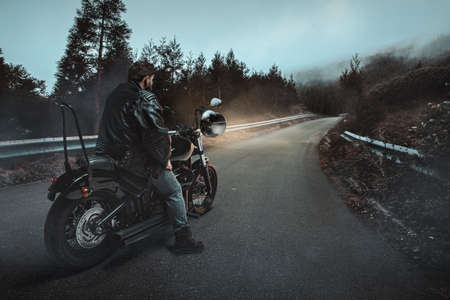 Rear view of muscular man, professional biker in leather outfit sitting on bike at suburban highway in evening. Concept of dream, travel, style, techno and achievements