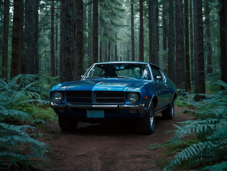 Antique car driving on rural meadow, sunset, headlight shining generated by artificial intelligence