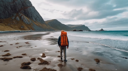 A man with a backpack walks along the seashore on a cloudy day.