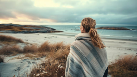 A girl by the sea on a cold day, watching the sunset wrapped in a woolen shawl.