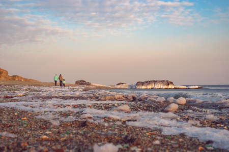 Winter landscape with frozen sea and icy beach. Dramatic seascape. Storm and snow weather.