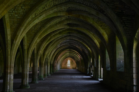An exterior view of the ruined Fountains Abbey church building in Yorkshire in England.