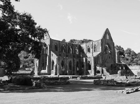 TINTERN, UK - CIRCA SEPTEMBER 2019: Tintern Abbey (Abaty Tyndyrn in Welsh) ruins in black and white