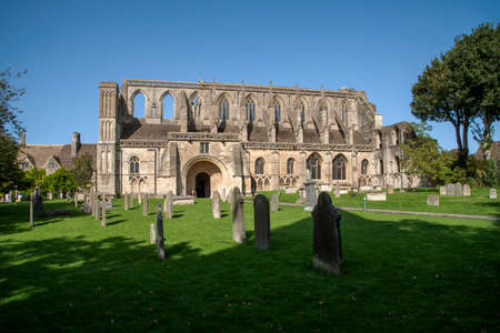 Malmesbury, Wiltshire, England, UK. 2020. The exterior of the 12th century Malmesbury Abbey and graveyard.