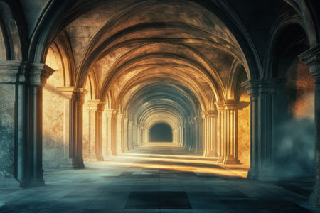 An expansive corridor showcases grand arches, warm light filtering through, creating an enchanting atmosphere.