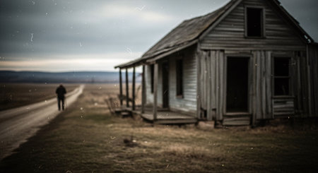 a man gazes at a house in the fields, capturing the essence of a country scene. this photo exudes an eerily realistic and film noir-esque atmosphere, reminiscent of iconic civil rights imagery. the prairiecore aesthetic is evident in the dusty piles and whistlerian style, showcasing distinctive characters within the frame. ai generated
