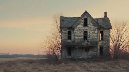 Old, dilapidated house stands on a field, surrounded by trees. The scene is bathed in the muted light of dusk, creating a somber and eerie atmosphere.