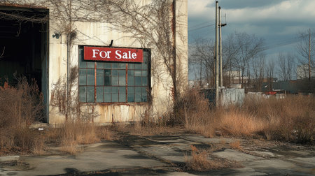 An eerie scene of an abandoned industrial building displaying a weathered For Sale sign and surrounded by overgrown vegetation, capturing urban decay.