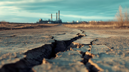 Large cracks splitting asphalt roads lead toward a polluting factory at sunset, highlighting the stark realities of environmental damage and economic decline