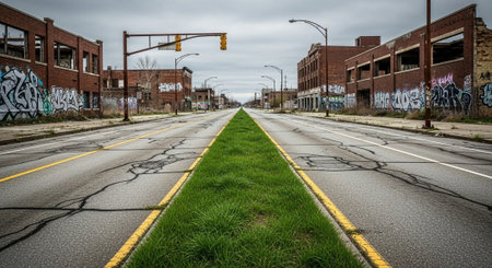 abandoned urban structures, abandoned buildings loom over the desolate city street, with boarded-up windows and locked doors