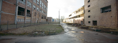 Abandoned industrial area of the city in the rays of the setting sun, Realistic Post Apocalypse Landscape