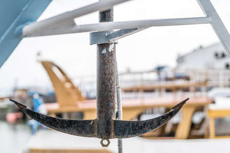 Close up of an used hanging small metal anchor of a fishermen boat in Virpazar, Montenegro