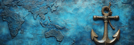 A detailed nautical map complements a bronze anchor, set against a vibrant blue background that leaves space for additional text.
