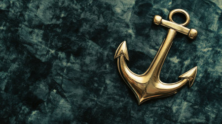 This captivating image features a polished golden anchor positioned on a textured dark green canvas, making it an ideal representation of nautical themes.