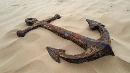A weathered rusty anchor lies on a sandy beach, surrounded by golden sand under a clear blue sky, evoking feelings of nostalgia and adventure.