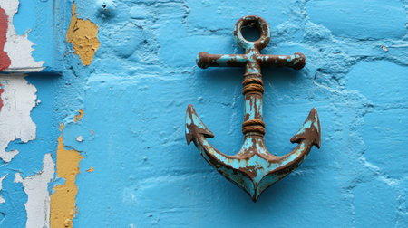 This image features a vintage rusty anchor mounted on a vibrant blue wall, showcasing unique textures perfect for nautical decor and artistic inspiration.