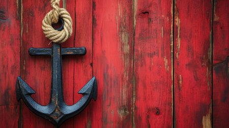 This image features a vibrant red anchor resting against a weathered wooden background, representing nautical heritage and maritime culture. Perfect for decor.