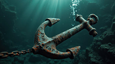 That the image is generated using AI. Rusted anchor resting on seabed amidst aquatic tranquility and particulate suspense.