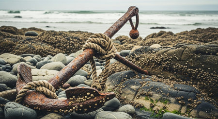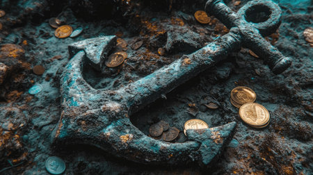 An aged anchor, rendered in detailed focus, shows signs of extensive use and weathering. Its teal and brown patina conveys a sense of historical significance. The composition includes a coiled rope, adding a textural contrast. Suitable for illustrations of maritime themes or designs focused on history and design.
