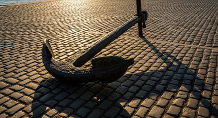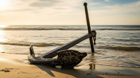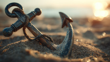 A vintage anchor half-buried in golden sand, illuminated by warm sunlight, captures the essence of the beach and evokes feelings of tranquility and adventure.