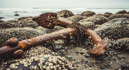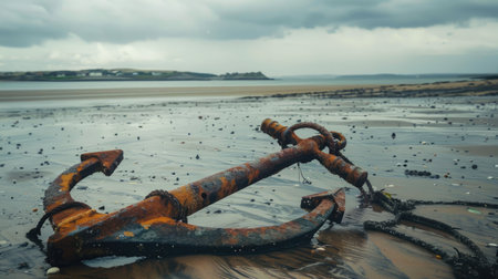 A detailed close-up of a rusty anchor resting on sandy beach, capturing the essence of maritime heritage with a soothing bokeh background that evokes serenity and nostalgia.