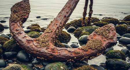 AI Generated. A rusty anchor is sitting on a beach covered in seaweed