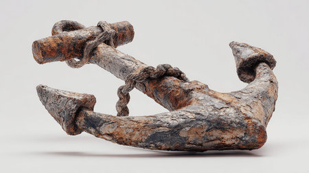 An antique anchor, intricately detailed, is the central focus, wrapped with a natural rope. The object is set against a dark grey backdrop, with careful lighting highlighting its texture and form. The image is suitable for various commercial uses, including illustrations and conceptual designs.
