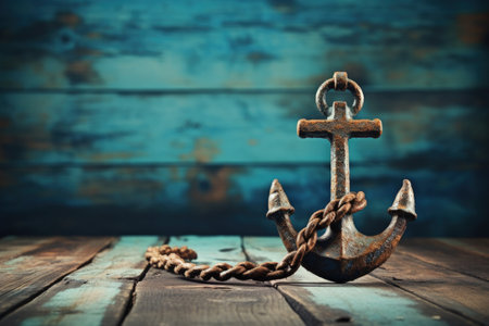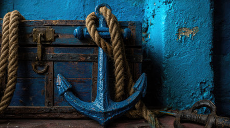 An aged wooden chest and a blue painted anchor are the focal points of the image, with a thick rope draped over it. The setting features a textured blue wall providing the background, while the lighting appears dim. This visual is suitable for design, illustration, and conceptual projects.