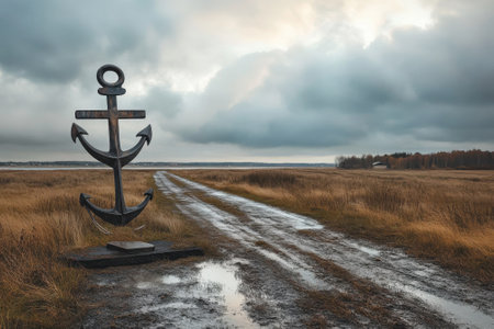An old anchor rests next to a muddy dirt road surrounded by tall grass and cloudy skies in a serene location.