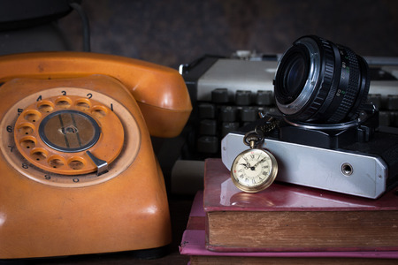 Group of objects on wood table. old watch, old telephone, old camera, type writer, Still life