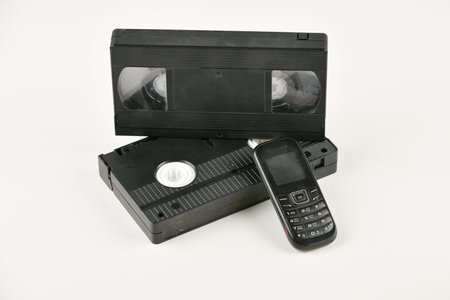 Retro objects on a white background. push-button telephone and video cassette. Analog media technology of the past. Copy space.