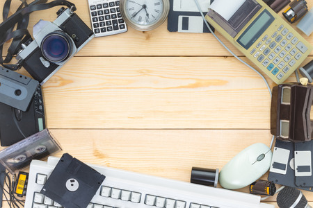Background with old electronics placed in a circle on a wooden table with such items as calculators and floppy disks