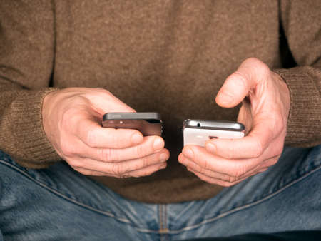 Hands holding two smartphones and tap text