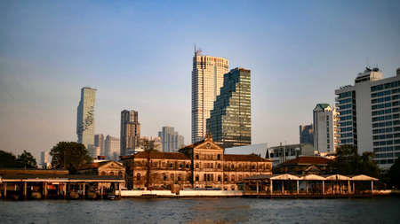 January 2 2021 - Bangkok, Thailand : Beautiful Landscape of Chaopraya River with high modern building and old customs house