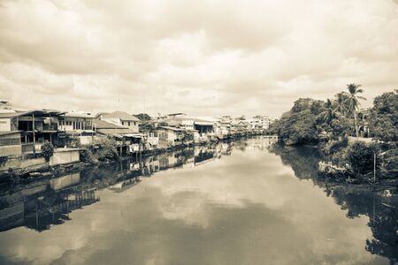 Abstract blur beautiful bangkok city skyline around chao phraya river in Thailand - Vintage Filter