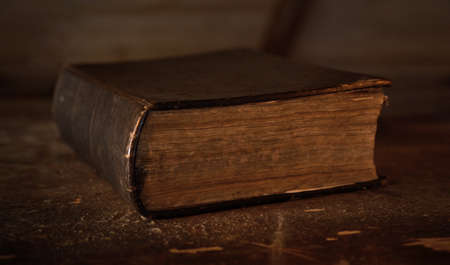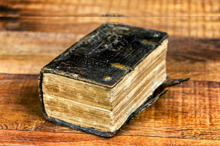 Very old rustic book, with tattered edges and a weathered cover, lies on a smooth surface, showcasing its rich history and character.