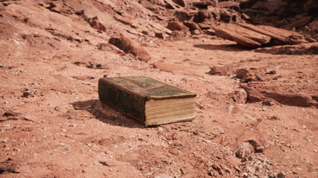 A weathered book lies motionless on the dry, cracked earth, surrounded by reddish brown rocks under the glare of a midday sun. Its worn cover suggests a long lost story waiting to be found.