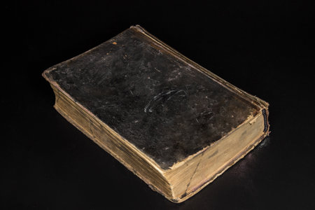 Aging book rests upon glass table with reflection. Subjects on black background close-up