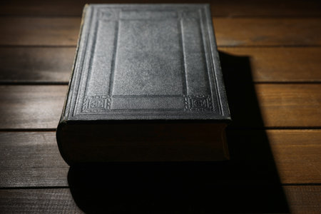 Bible with dark cover on black wooden table, closeup. Christian religious book