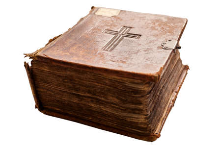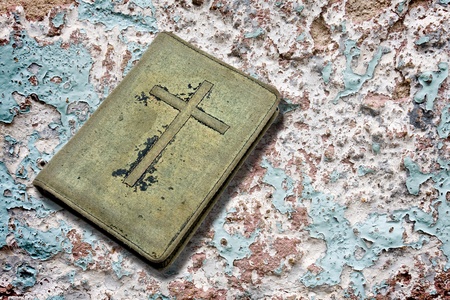 Very old holy bible book with worn pages. Necklace with copper decorative cross. Close-up.