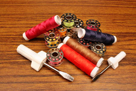 Sewing thread on a wooden background. Set of threads on bobbins