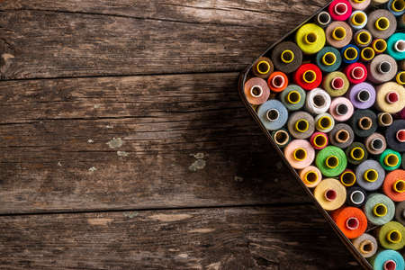 Colorful threads for sewing. Different threads on wooden vintage reels.