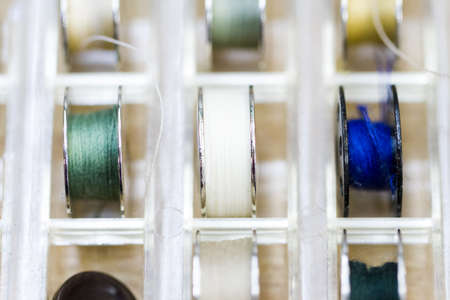Colorful bobbins of thread in bobbin box in tailor shop.