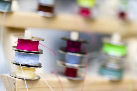 Multicolored threads on the bobbin from the sewing machine on a blurred background from the other bobbins