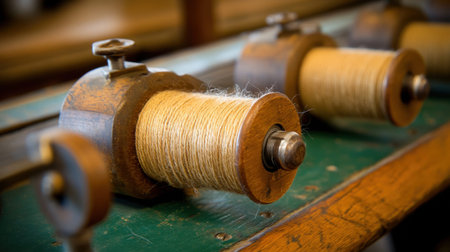 Explore this captivating image of vintage spools of thread resting on a wooden table, showcasing the charm of an old sewing workshop with natural lighting.