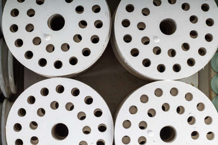 Raw spindles of industrial cotton in a weaving factory, hand weaving cotton for the fashion and textiles industry. Yarn weave traditional textile fabric manufacturing for clothing and fashion